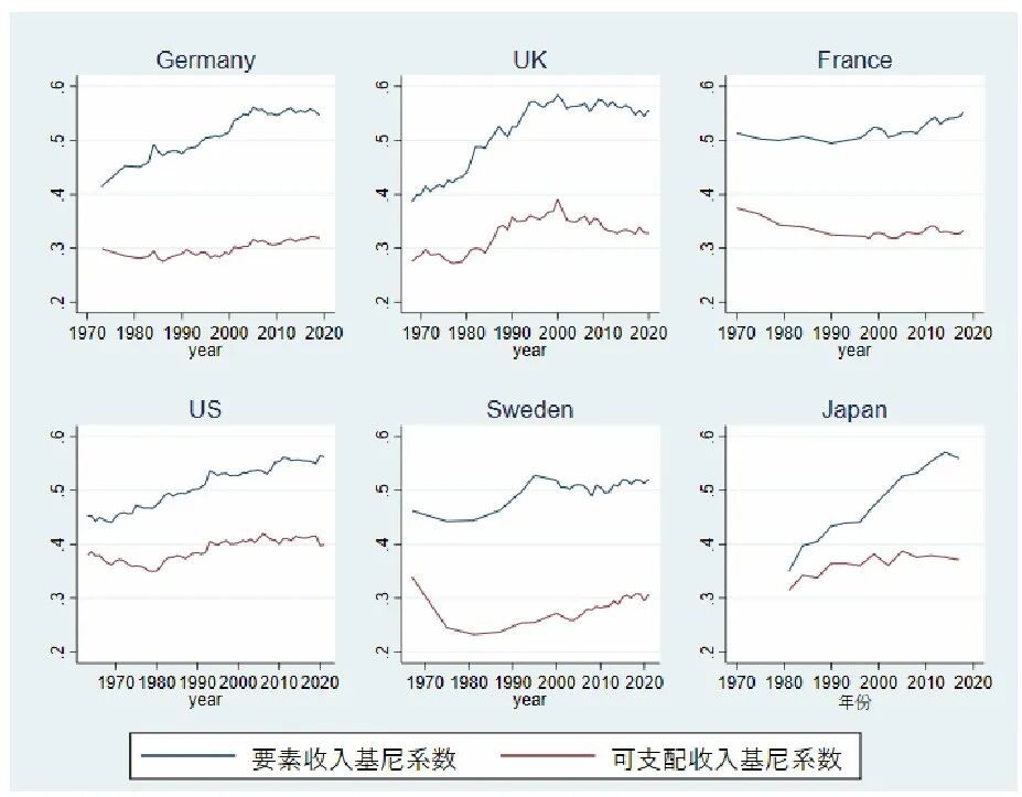 事实一:再分配政策是缩小居民收入差距最有效手段。可支配收入基尼系数的变化趋势在很大程度上追随市场收入基尼系数的走向,但二者之间的差距完全是再分配政策作用的结果,没有再分配政策,各国可支配收入基尼系数不会降至0.4以下。