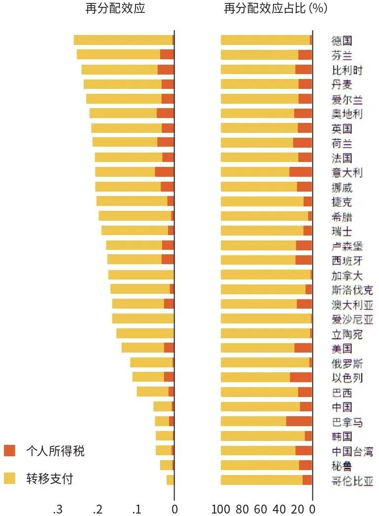 收入再分配政策有两种工具手段:一个是个人所得税,即对高收入人口进行课税;另一个是社会保障支出(又称政府转移支付),即政府通过养老保险、医疗保险或者其他社会保障项目向居民家庭进行的转移支付。衡量某一项再分配政策是否降低了收入差距或者在多大程度上降低了收入差距,最直观的办法就是比较政策介入前后的收入不平等程度。以个人所得税为例,衡量方法为比较税前与税后的基尼系数,如果税后基尼系数变小了,说明个人所得税缩小了收入差距。