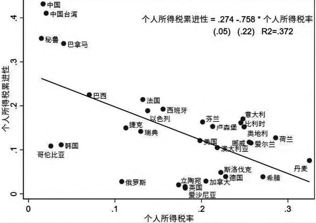 事实三:平均税率(规模)和累进性是个人所得税再分配效应的两个决定因素,规模的作用远远超出累进性,且税率与累进性之间呈现负相关关系。税率跟收入之间是正相关关系,收入越高,用于缴纳个人所得税的比例也高,即累进性;规模即平均税率,指的是从居民家庭总收入中通过个人所得税能拿出来多少。如果想让个人所得税发挥缩小收入差距的作用,它必须是累进的,否则它是累退的,这决定了个人所得税是扩大还是缩小收入差距。在累进性一定的情况下,个人所得税的规模几乎决定了再分配效应的大小。