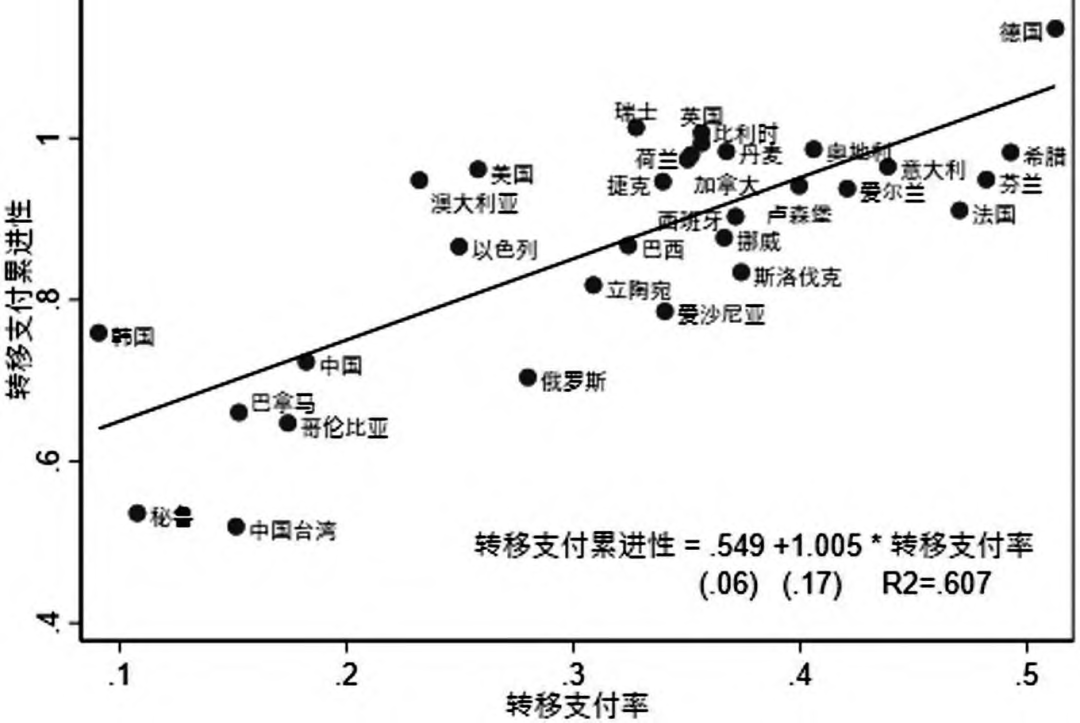 事实二:社会保障支出(政府转移支付)的再分配效果远大于个人所得税。个人所得税的收入分配效果取决于其累进性和规模。个人所得税要缩小收入差距,税负要向高收入人口倾斜。只有个人所得税税率随着收入水平的上升而上升、与收入呈正相关关系,个人所得税才能缩小收入差距。而正相关关系就是所谓的累进性,税负的分配倾向高收入人口。在累进性一定的情况下,个人所得税在多大程度上能够缩小收入差距,则取决于个人所得税的规模。转移支付的作用对象不是高收入人口,而是低收入人口。转移支付通过提高低收入人口的收入水平来缩小收入差距,因此累进性变成负数,其绝对值越大说明资金分配越倾向于低收入人口。在规模一定的情况下,累进性越大,缩小收入差距的程度也越大。转移支付的收入分配效应占一个国家再分配效应87%左右,而个人所得税只占13%左右。这个结构跟国家几乎没有关系,无论是有较强再分配效应的发达国家,还是有较弱再分配效应的发展中国家,都改变不了社会保障支出在整个再分配效应中起决定性作用的事实。