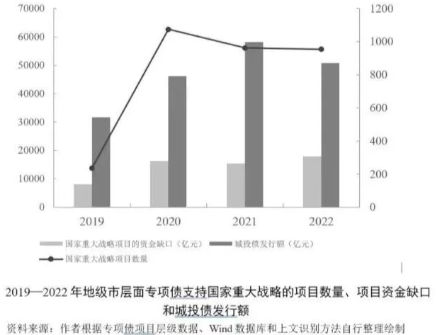 研究中我们还发现了风险混杂的特征,如果专项债项目用于支持国家重大战略,可能会引发融资平台债务的风险上升。专项债支持国家重大战略的项目数量不断增加,这些项目资金缺口较大。为了弥补这些资金缺口,地方不得不通过融资平台举债的方式筹措资金,所以导致了风险的混杂(如下图所示)。我们发现,要支持国家重大战略项目,仅依靠一笔专项债是不够的,往往还需要融资平台配套再借一笔债,并且后者比前者规模更大,风险进一步放大。这些效应在财政缺口和当地发展压力较大的地区更为明显。
